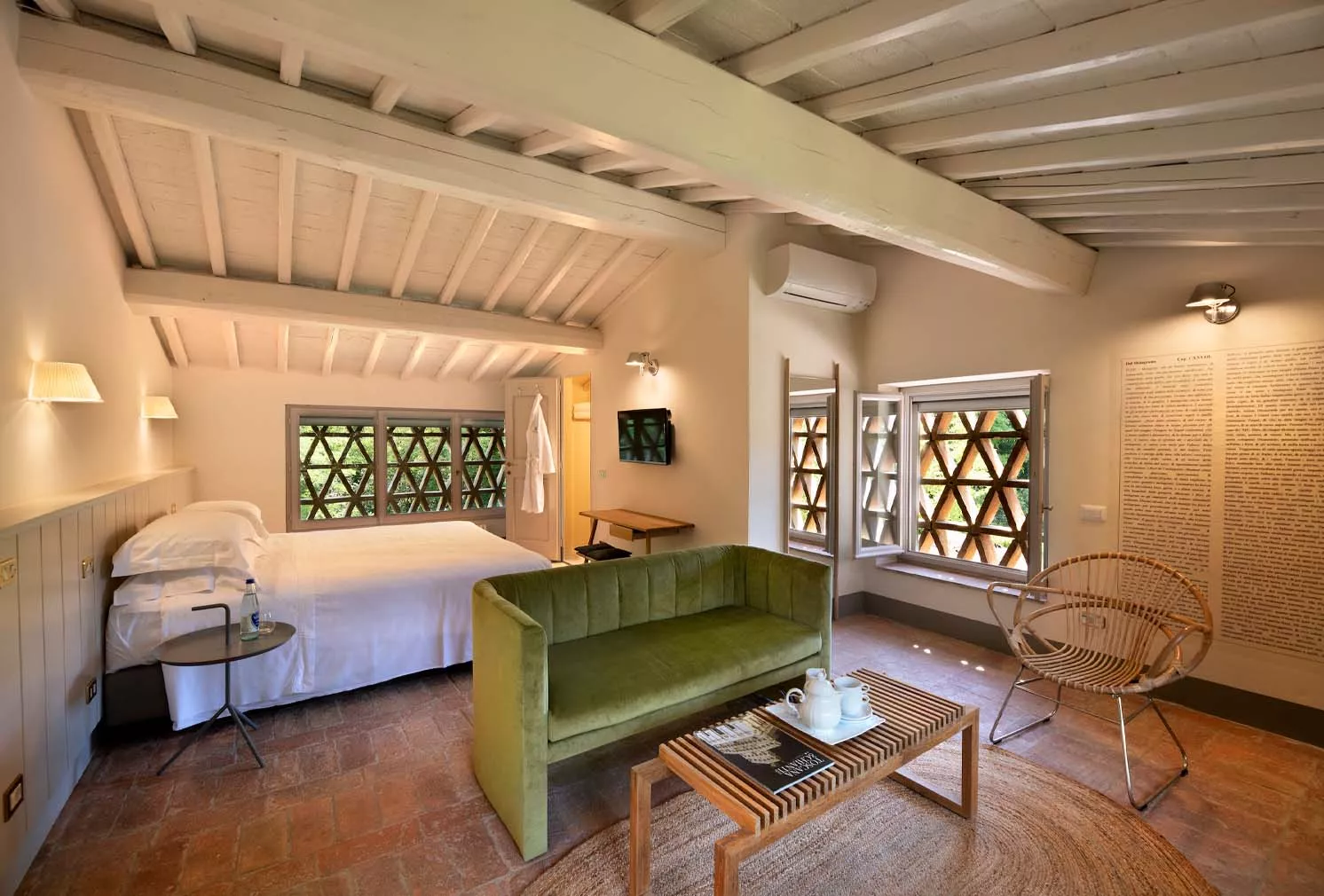 The interiors are enhanced by exclusive graphic details inspired by the botanical illustrations of the 16th-century botanist Gherardo Cibo, adding a distinctive artistic character. The result is an intimate and relaxing environment, ideal for guests seeking comfort, style, and a sense of timeless elegance.